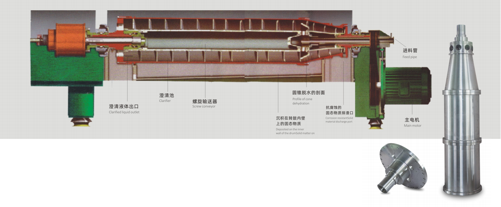 該機轉鼓由主電機帶動,變頻電機和齒輪箱(或液壓馬達)構成轉鼓和螺旋之間差速系統,轉鼓和螺旋在同一軸線以不同轉速同向旋轉,懸浮液通過固定的進料管,經螺旋出料口進入轉鼓,在高速旋轉的離心力作用下,比重較大的固相顆粒沉降到轉鼓內壁,在螺旋差速的作用下,不斷將沉降在轉鼓內壁上的固相顆粒刮下并推向轉鼓小端,從排渣口排出,比重較小的液相在轉鼓內形成內層液環,沿螺旋槽不斷被澄清,且流向轉鼓大端,從口徑可調的溢流堰板口溢出,從而實現了固液二相或三相分離。轉鼓轉速、轉鼓和螺旋之間的差速,根據分離物料特性進行無級可調。