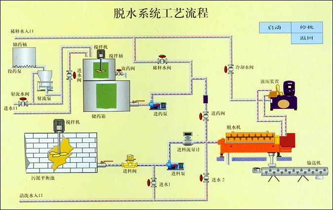 絮凝劑(粉劑或液劑)在配藥箱十按比例稀釋并充分溶解攪勻后,進入儲藥箱,山加藥泵控制,以脫水工藝要求確定的流量,經(jīng)稀釋水按0.08—0.12%濃度稀桿后進入脫水上機與待處理污泥混合,絮凝成繁華,污泥經(jīng)脫水主機脫水處理后,被澄清的污水山澄清液的管道排出,脫水污泥則源源不斷地從主機排渣口排出,再由柔性無軸污泥輸送機(或泥渣輸送泵)移送至指定地點或直接裝車外運。待處理的污泥連續(xù)不斷輸入,澄清液及脫水污泥源源不斷連續(xù)排出、輸送是一個全自動處理過程。格套裝置的加藥、進料、污泥輸送及主機的運行狀況均由全自動PLC電—液控制箱檢測、控制,使該裝置成為全自動的成套操作單元。